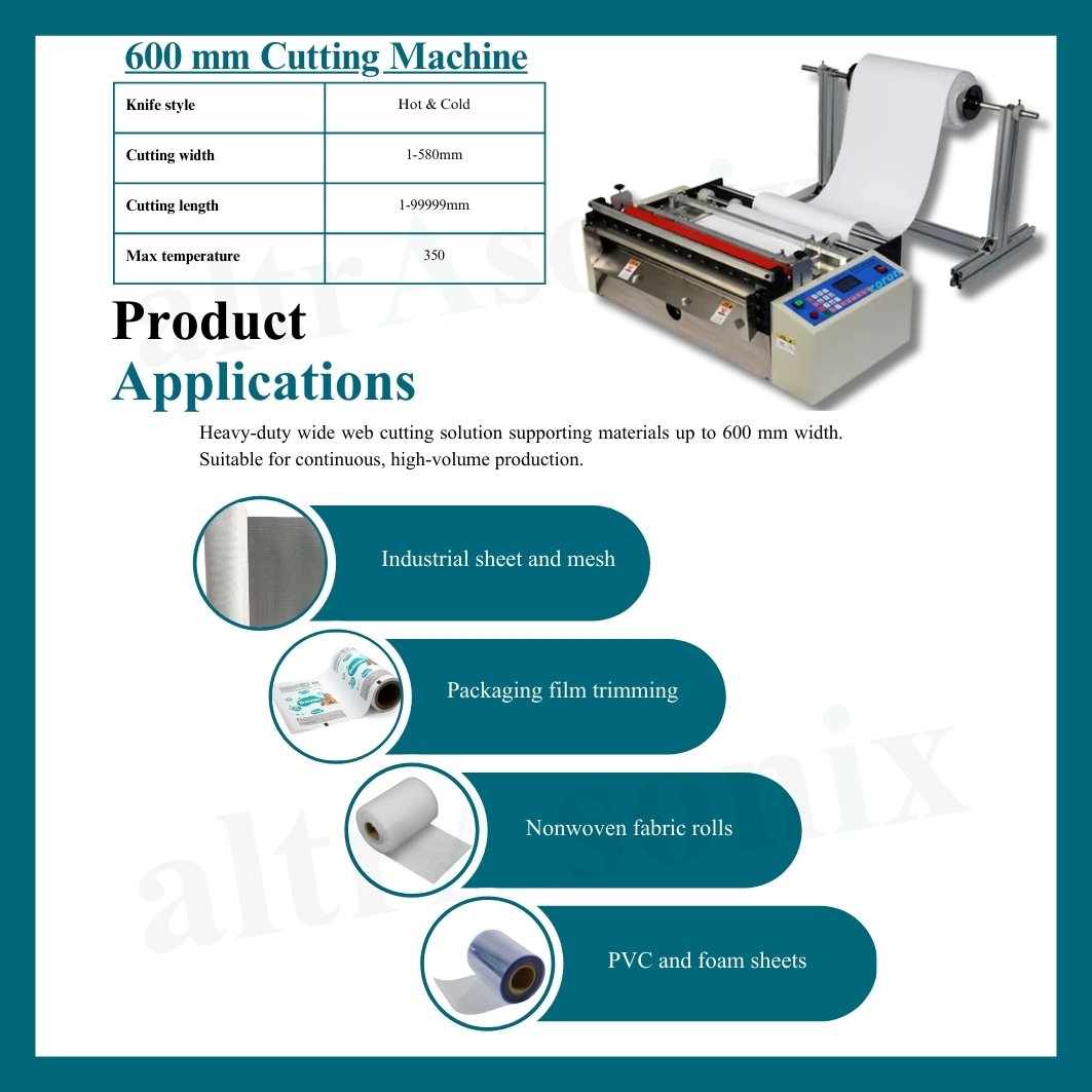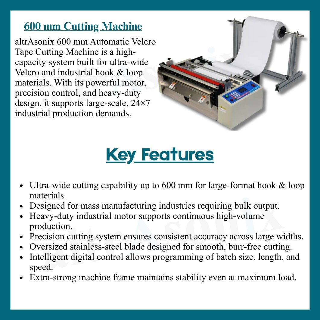 Hot & Cold Lanyard Cutting Machine – 600 mm by altrAsonix is a high-capacity industrial cutting system engineered for extra-wide textile rolls, industrial lanyards, and technical fabric strips. With an impressive 600 mm class cutting capacity, this machine is built for heavy-duty applications and continuous large-scale production environments.